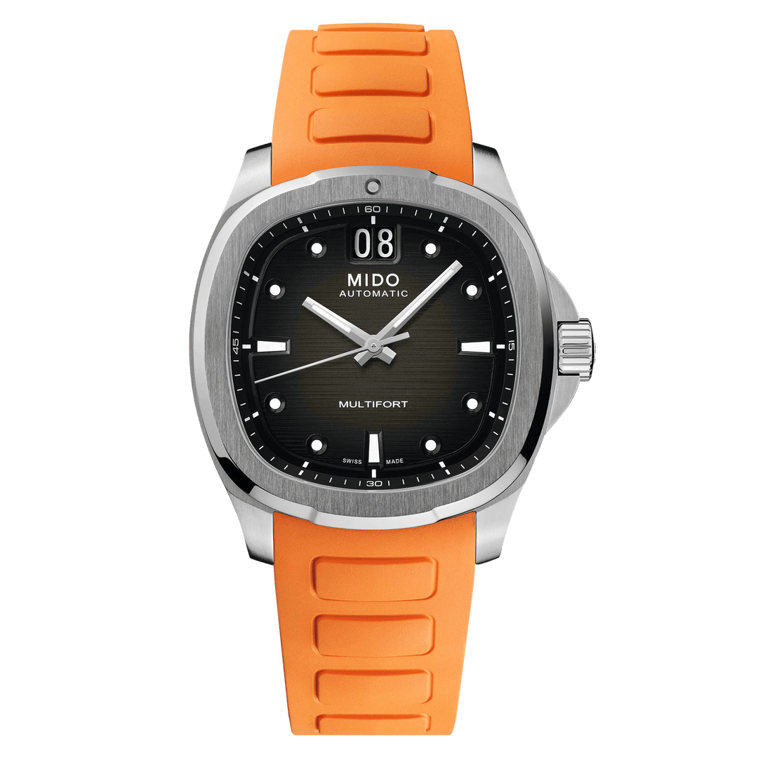 A brilliant flashback! Born from MIDO's extraordinary heritage, the TV-shaped case returns to the centre stage for the Multifort TV Big Date, as intense as it is precise, thanks to its formidable mechanical movement. The modern and dynamic design of this Swiss watch is underlined by a striking horizontal brushed finish dial and, along wtih its distinctive function: the BIG DATE at 12 o'clock. Its formidable latest-generation automatic movement, Calibre 80 is equipped with a high-tech balance spring in Nivachron™ which offers outstanding resistance to shocks and magnetic fields.