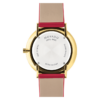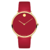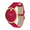 Movado Museum Dial Modern 47 watch, 40 mm yellow gold PVD-finished stainless steel case, 6.30 mm thin, with red dial and yellow gold-toned original flat dot and stick hands, red calfskin strap with yellow gold PVD-finished stainless steel classic tongue buckle.