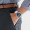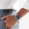 The evolution of modern design with a sharp look and elevated feel. Crafted from stainless steel, this sleek timepiece features a statement-making 40mm case that houses a captivating micro-textured dark blue dial with slim hands and our iconic dot motif at 12 o’clock. A flexible H-link bracelet completes the design.