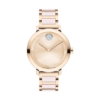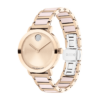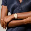 The evolution of modern design with a sharp look and elevated feel. Crafted from pale rose gold ion-plated stainless steel, this timepiece features a statement-making 34mm case that houses a matching micro-textured dial with slim hands and our iconic dot motif at 12 o’clock in sparkling crystals.